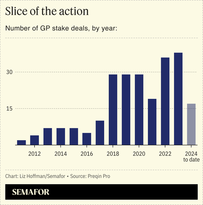 The business of money managers buying stakes in other money managers is booming. From essentially a dead start in the early 2010s, there were 38 such deals last year, and new rivals are jumping in all the time. Blue Owl raised a record $12.9 billion fund to acquire stakes in other managers last year, and is already out raising its next.