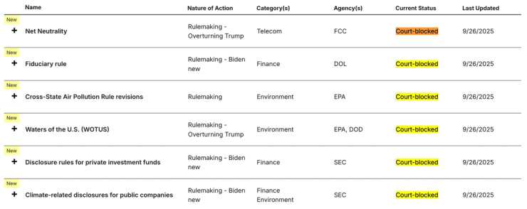 - This image, from Brookings Institution’s regulation tracker, shows the court-imposed limits of Trump’s stabs at traditional rule-writing. His success rate on Oval Office displays is far higher.