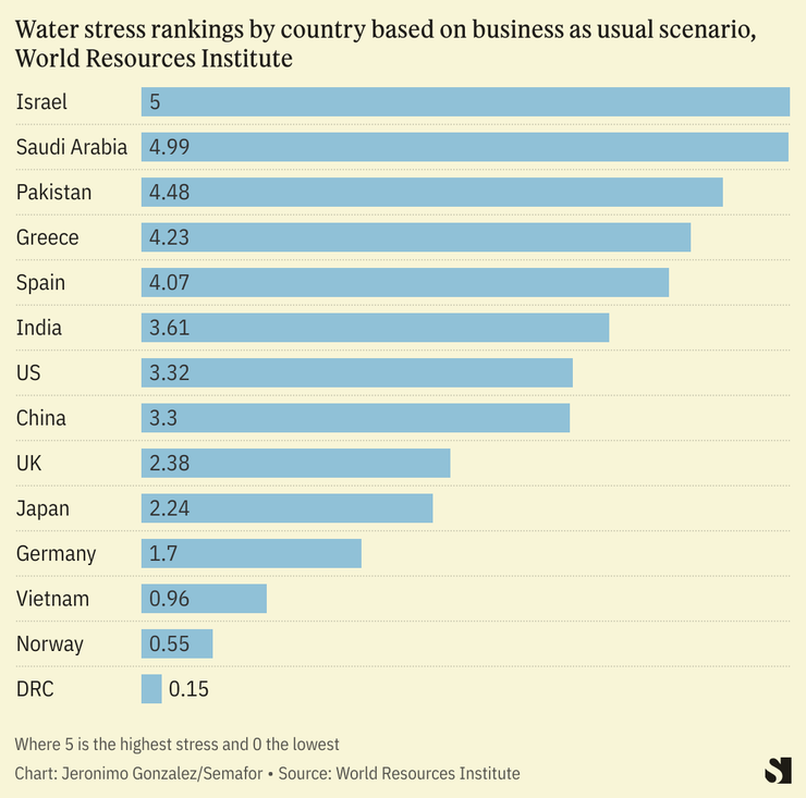 Growing population and rising global temperatures will further strain the world’s fast-depleting freshwater reservoirs. A recent World Resources Institute report said that almost three billion people will face an extremely high risk of water shortage, while around 40% of the world’s population will live in areas with at least a high risk. The Middle East and North Africa will be the regions with the highest water stress in the world. “Water challenges are only going to become more frequent and more intense,” Heather Cooley of the Pacific Institute told The Washington Post. “That needs to motivate us to begin preparing and implementing projects.”