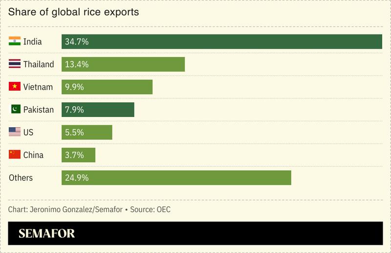 Pakistan was an “unintended beneficiary” of India’s export curbs, experiencing a more than 60% growth in rice export volume thanks to its emergence as an alternative supplier for countries across the Gulf, Africa, and Southeast Asia, Al Jazeera noted. Pakistan has since withdrawn its minimum export price (MEP), which would have undermined competitiveness with India back in the game, experts told the outlet. But local farmers, oppose the removal of the MEP: “Volume-wise, we cannot compete with India, so we should have maintained some price floor instead of removing it entirely. Now anyone can sell at any price, which could perhaps increase sales volume but drive prices down,” one said.