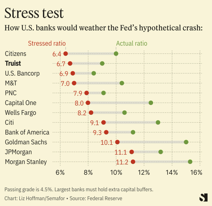 Regulators are likely to raise banks’ required ratio of loss-absorbing capital to assets, and Truist was cutting it close in its latest Fed stress test. “We’re in a build-capital mode,” CEO Bill Rogers said at an industry conference in May. “We’re going to be in build mode until we have more information, more certainty” about regulators’ plans.