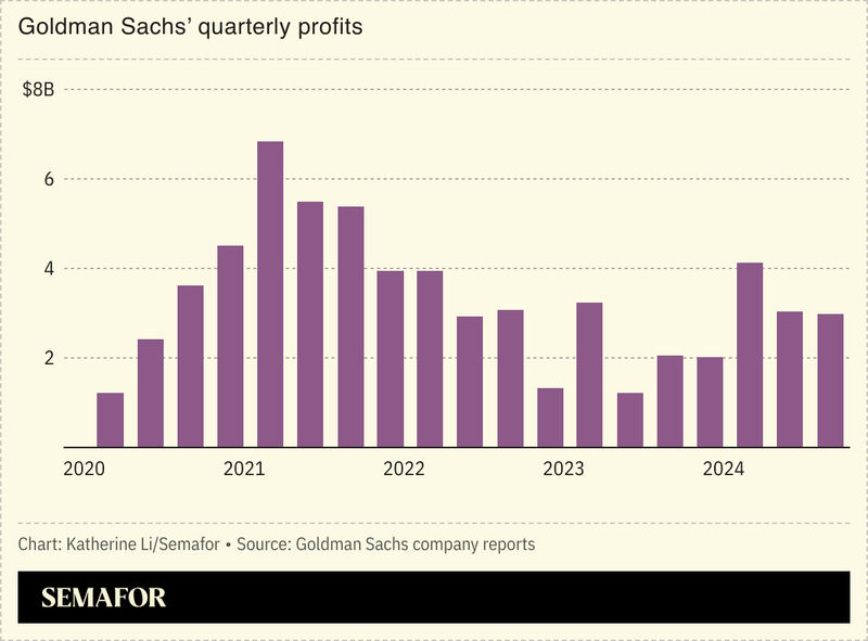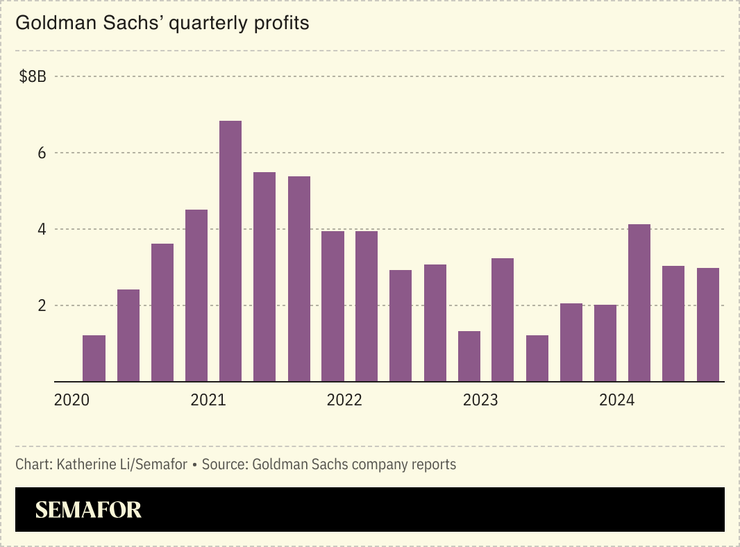 Goldman Sachs, which caters to Wall Street rather than Main Street, reported $3 billion in third-quarter profits despite a slowdown in corporate mergers. Economically, “the world is trending to above average,” a Goldman executive said. A new survey of fund managers found them more optimistic than they have been in years, selling bonds and buying stocks — generally a bullish sign.