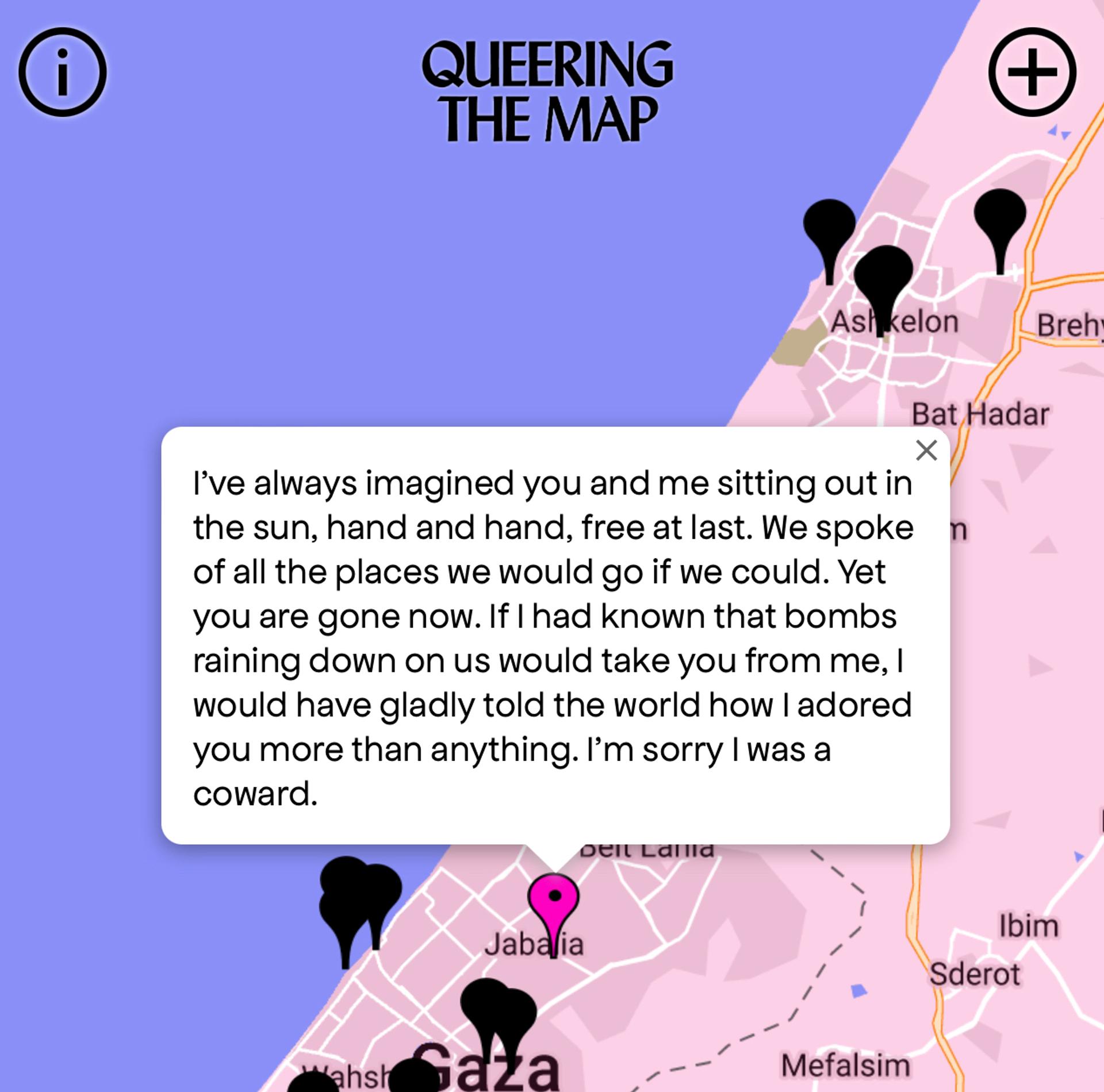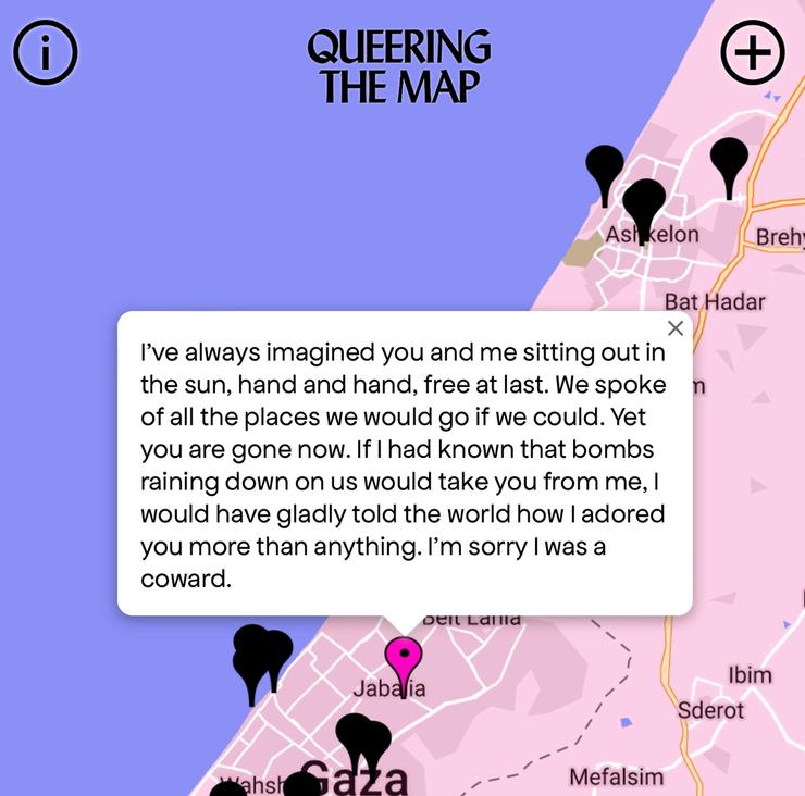 “My biggest regret is not kissing this one guy. He died two days back,” reads one anonymous story from Gaza shared on Queering The Map, a website where LGBTQ people can document important memories from their lives pinned to any location around the world. “He died in the bombing. I think a big part of me died too. And soon I will be dead. To younus, i will kiss you in heaven.”