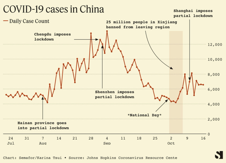 In the lead up to this week’s Party congress, measures to enforce the policy have intensified, with only a few dozen cases spurring partial or full city-wide lockdowns, as authorities impose frequent and widespread testing. Most recently, Chengdu, the capital of Sichuan province, forced its 21 million residents to stay home for two weeks after a few hundred cases were detected.