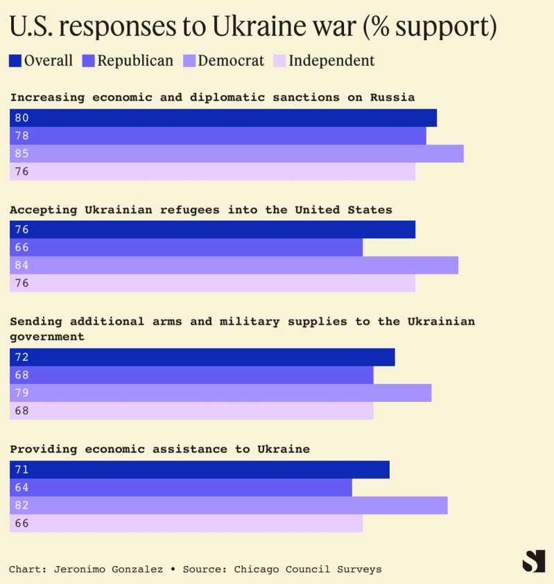 According to the Chicago Council on Global Affairs’ annual survey, over 70% of all respondents — and roughly two-thirds of Republicans — favor sending additional financial and military support to Ukraine.