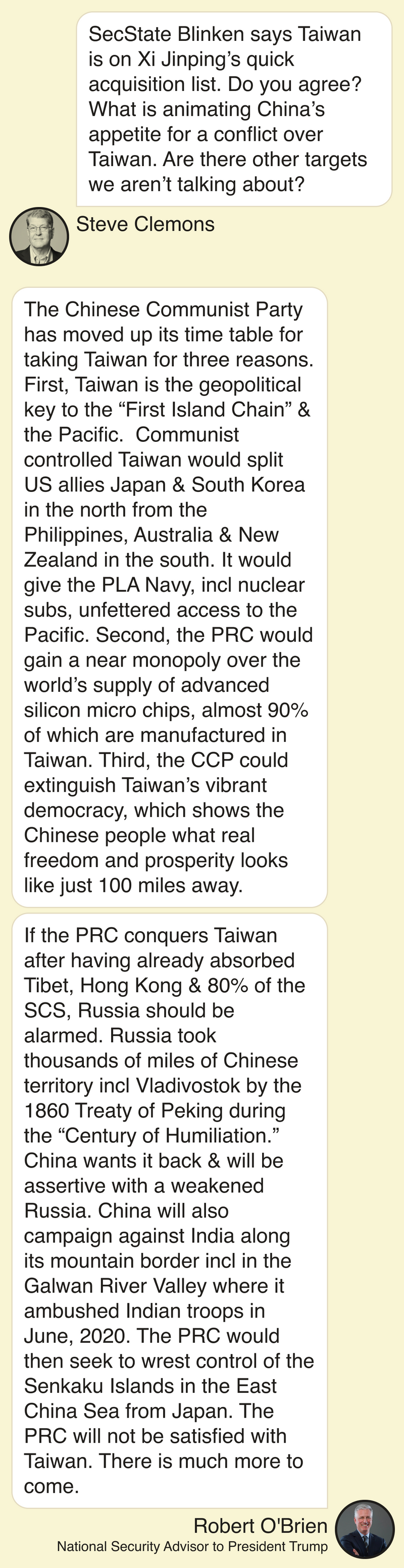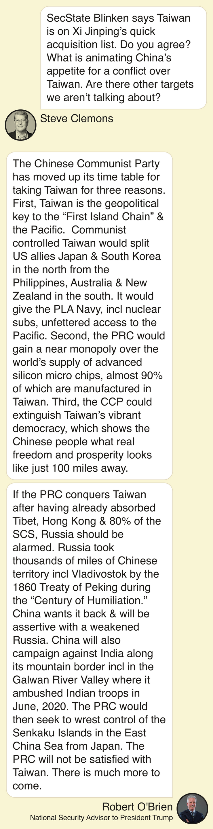 In a text to Semafor’s editor-at-large Steve Clemons, President Trump’s last national security adviser, Robert O’Brien, had an ominous warning for Russia. If China succeeds in retaking Taiwan, he predicted, it will then come for thousands of miles of territory that Russia absorbed after the 1860 Treaty of Peking during what is referred to in China as the “Century of Humiliation.”
