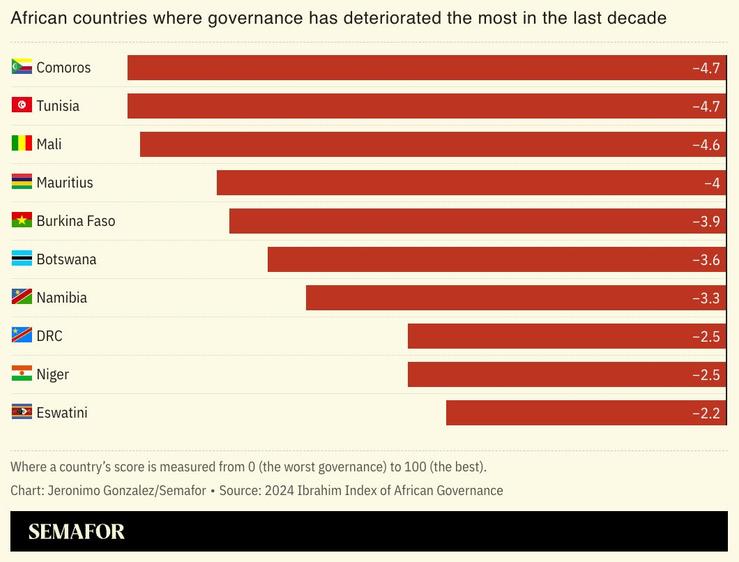 Burkina Faso was listed among the countries with the most deteriorated governance scores. One of several nations in the Sahel — a region that straddles the Sahara desert — the country has experienced several coups in recent years.