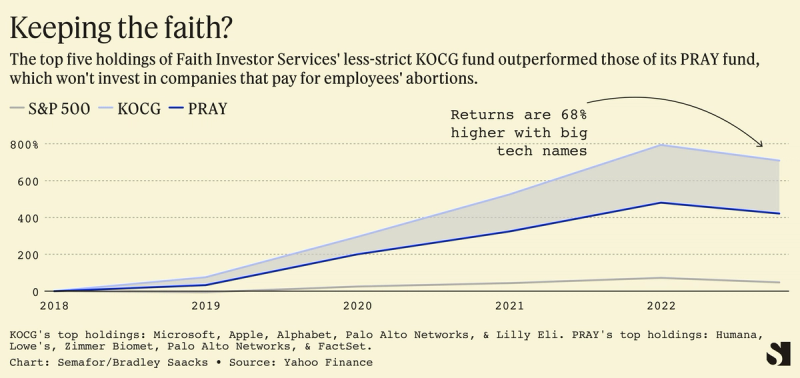More than 130 funds managing some $22 billion in the U.S. invest along Christian principles, according to data provider Lipper. They are now trying to balance their moral values with market values. For many, specifically those that follow a “biblically responsible” framework, that means avoiding companies that cover some of the expenses of employee abortions – a list that includes some of the best-performing stocks of the past several years, including Apple, Microsoft, and Alphabet.