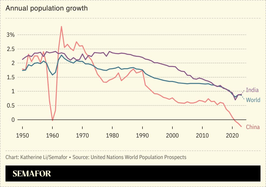 The world’s two most populous countries are now grappling with demographic challenges. India’s population growth rate has slowed, and the heads of two states in the country’s south — where the fertility rate has sharply dropped — recently urged families to have more children. Leaders are concerned that slowing population growth in southern India could lead to less representation in the federal legislature.