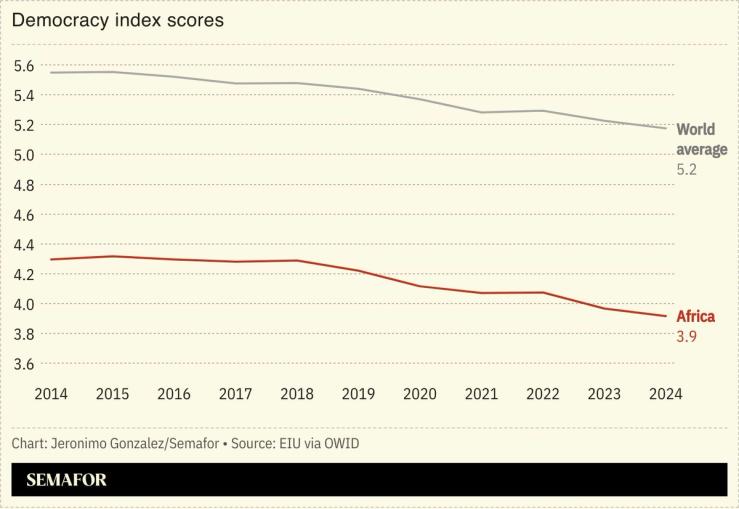 Africa’s democracy index score has regressed recently, shrinking each of the past six years, pointing at voter dissatisfaction and weakening institutions. Unless democracy “improves lives and livelihoods… not just those of the political elites, it will remain shallow and hollow,” one regional expert wrote.