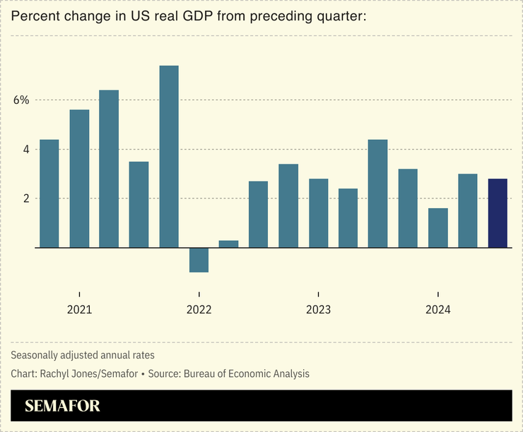 The report represents the final GDP data to be released under the Biden-Harris Administration, and with the economy consistently ranking as a top issue among voters, Wednesday’s economic reading might help bolster the case for Kamala Harris as president. Since the Biden-Harris Administration took office, GDP has increased a cumulative 12.6%, and this month, consumer confidence is up 11% — the biggest monthly increase since March 2021. To that end, the Harris campaign has doubled down on economic messages in its paid advertising and stump speeches, although this “is often less visible in daily coverage” in the media, Semafor’s David Weigel noted. Still, Friday’s jobs report isn’t expected to be as strong, with employment likely seeing a hit from two hurricanes and the Boeing strike.