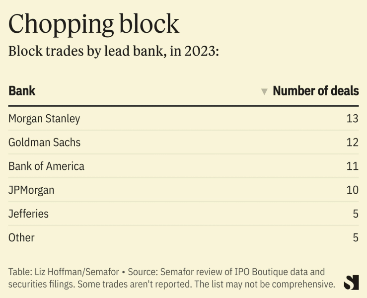 Morgan Stanley was the leader in block trading but pulled back while the government investigated, to the benefit of rivals. Its market share has fallen from about half between 2018 and 2021 to about 20% this year, according to a review of securities filings. The big winners appear to be JPMorgan and Bank of America.