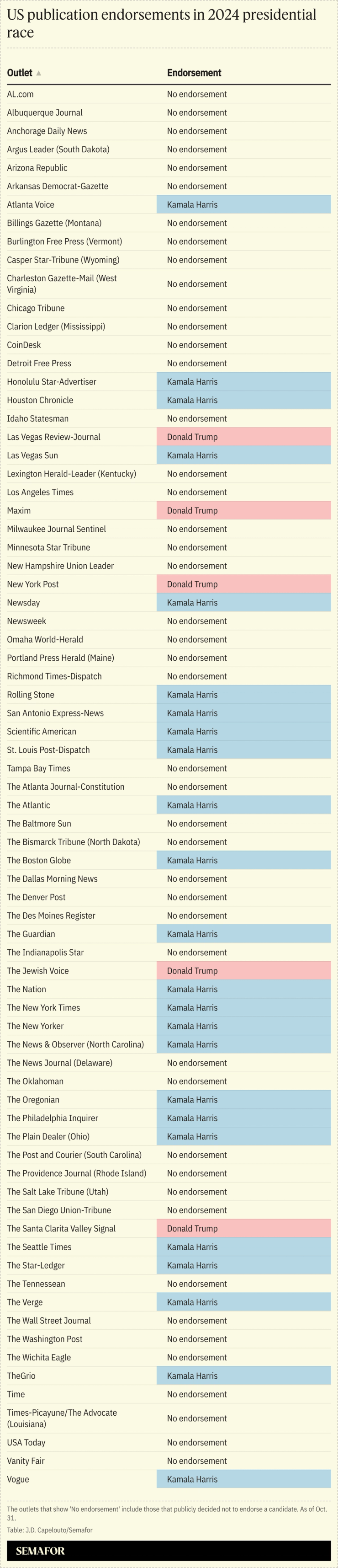 Across the US, print media has increasingly chosen not to endorse a White House contender this year, according to a Semafor review of every state’s newspaper of record, along with other notable local and national outlets and magazines. Of the publications that have endorsed, the overwhelming majority backed Harris, while a handful supported Trump.