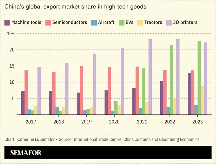 China is still on track to become a technological superpower despite US tariffs and export controls, Bloomberg reported. Of 13 key emerging technologies identified in a 2015 government report, China is a global leader in five of them — including electric vehicles and solar panels — and is catching up in seven others, Bloomberg’s researchers found.