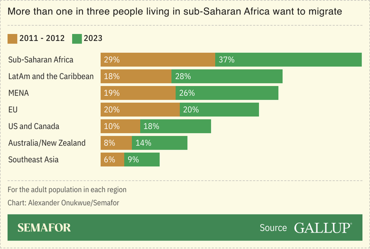 More than a third of Africans want to move permanently to live somewhere else, a new high, according to a 2023 survey by Gallup. In 2012, 29% wanted to migrate; last year the number was 37%.