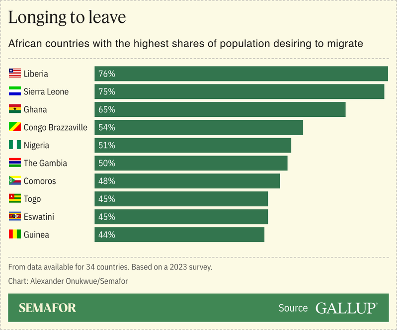 West Africa is the epicenter of the most intense push for migration away from Africa. The Gambia, Liberia, Sierra Leone, Ghana and Nigeria are five of six African countries where at least half the population wants to move abroad, according to Gallup. These countries are also in the top 10 countries worldwide with the highest desire for migration.