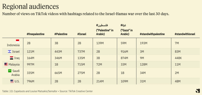The popularity of pro-Palestine content on TikTok is being driven primarily by users in the Middle East and Southeast Asia, while U.S. consumption on the platform is roughly split between both sides, according to an analysis of TikTok hashtag data by Semafor.