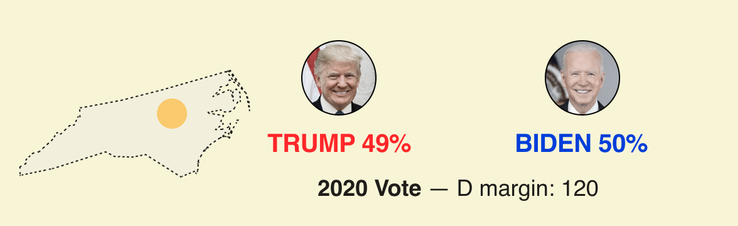 A very recent bellwether that has gone for the statewide winner in the last three presidential elections, by three-digit vote margins each time. In 2020, better turnout in the majority-white suburbs of majority-Black Rocky Mount gave the win to Biden. Trump made one of his last North Carolina stops here, and Gov. Roy Cooper, born in the county, also made it a priority. Funding for rural broadband in the 2021 Infrastructure and Jobs Act has largely not gotten results yet, but Cooper prioritized funding for Nash County, giving Democrats a Biden achievement to talk about.