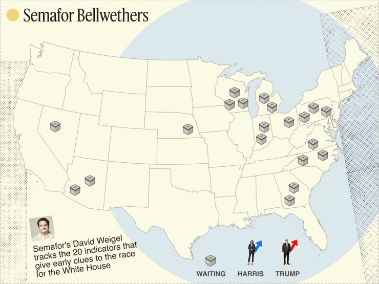 Election Day is upon us and analysts have never been less confident in their guess as to what’s going to happen in the presidential contest. If the race is as close as the polls indicate, it could take days to officially call — but there are plenty of early bellwethers, data points that will tell us which way the battleground states or key voting groups are trending. Here are the 20 counties that we’ll be tracking Tuesday night as part of Semafor’s election coverage — with an eye to which candidate beats their party’s 2020 result.