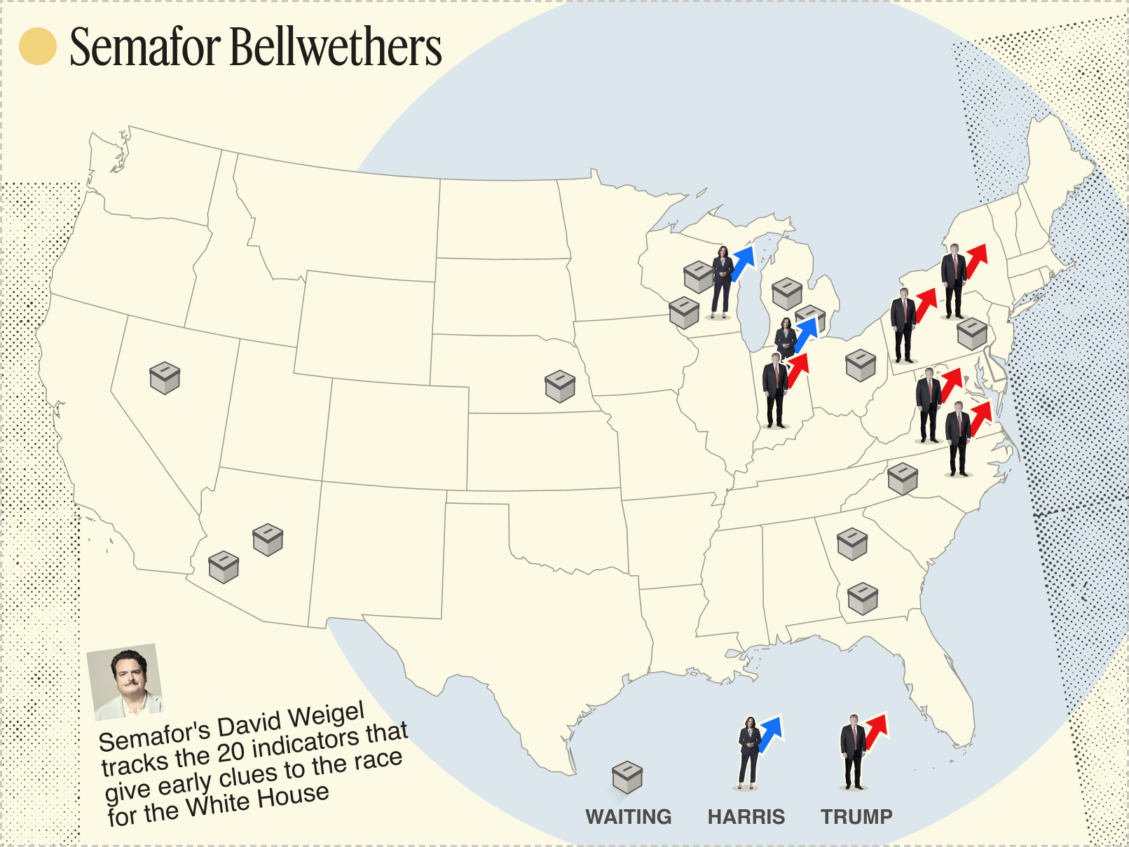 Welcome to Semafor’s Election Night Bellwethers. Our reporter David Weigel is tracking 20 counties that could provide clues throughout the night as to where the overall race between Donald Trump and Kamala Harris is trending. We’re also including updates and analysis from our congressional reporters, senior editors, and reporters in the field on key race calls and trends around the country.