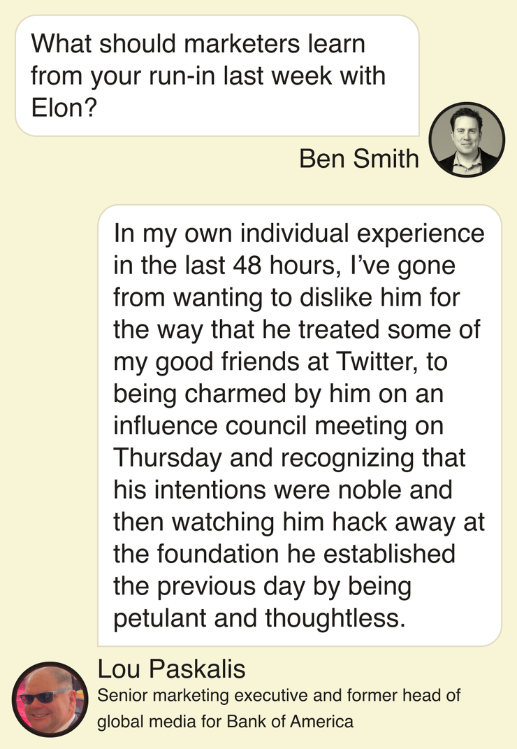 Lou Paskalis was among the advertising execs who talked to Elon Musk on Thursday. On Friday, Musk tweeted that advertisers leaving the platform were trying to “destroy free speech.” Paskalis responded that they care about “BRAND SAFETY/SUITABLITY” and Musk promptly blocked him.