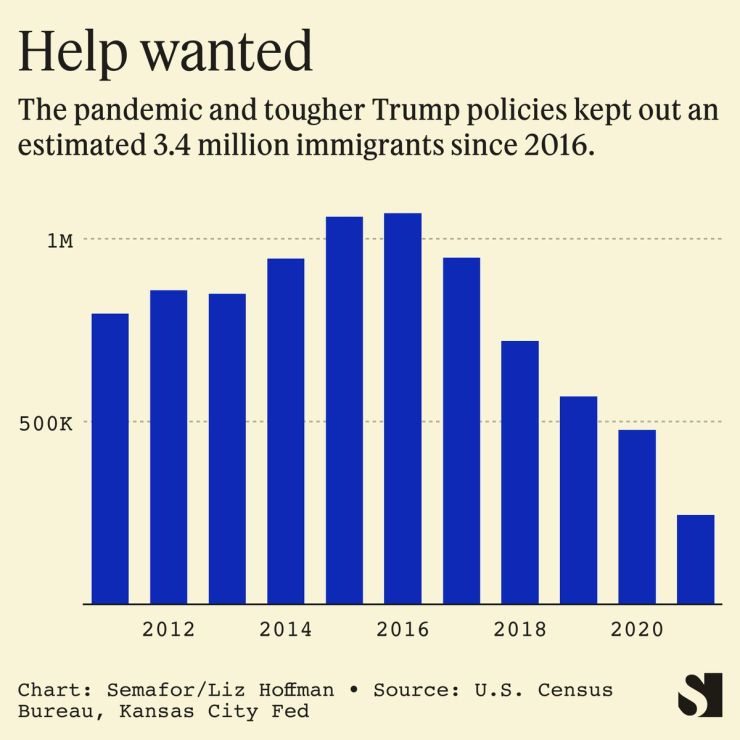 Companies are scrambling for workers and wage wars are fueling inflation. Approving more temporary visas for foreign workers might help, according to the Kansas City Fed, which says a decline in immigration under tougher Trump administration policies and, later, pandemic lockdowns contributed to the current worker shortage. Non-immigrant work visas fell from 5.5 million in 2015 to 1.5 million in 2021, it found.