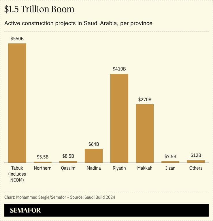 Beijing is gunning to solidify its place in Saudi Arabia’s fast-growing construction market, projected to become the world’s largest with a forecast value of $181.5 billion in 2028, according to real estate consultancy Knight Frank. The kingdom’s push to complete key projects before Expo 2030 and the men’s soccer World Cup in 2034 is creating a gold rush for construction firms. NEOM alone is expected to consume a fifth of the world’s steel output.