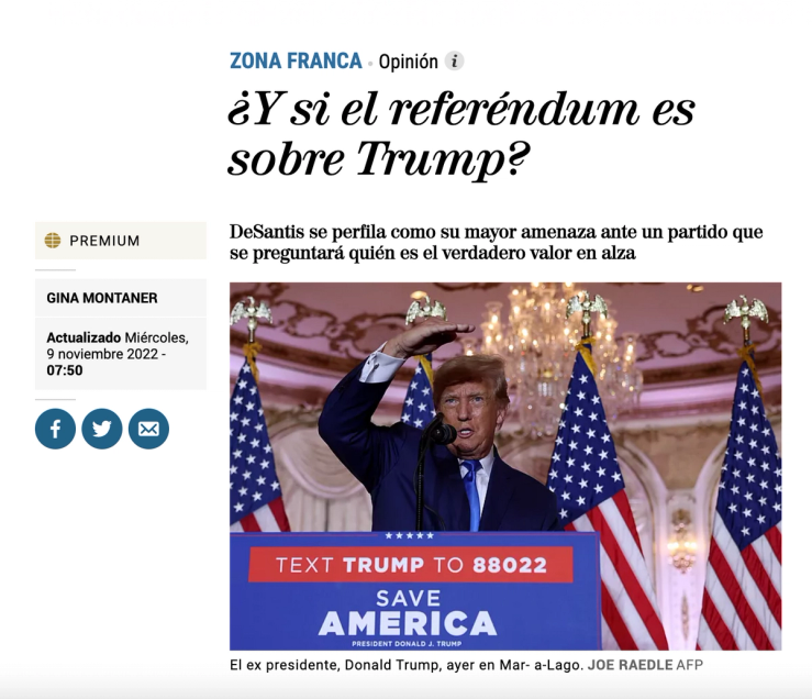 Similar to the leading story from Bild, Gina Montaner’s column in El Mundo, the second largest daily newspaper in Spain, examined how the outcome of the election may be more about Trump’s potential rivalry with DeSantis going into 2024.