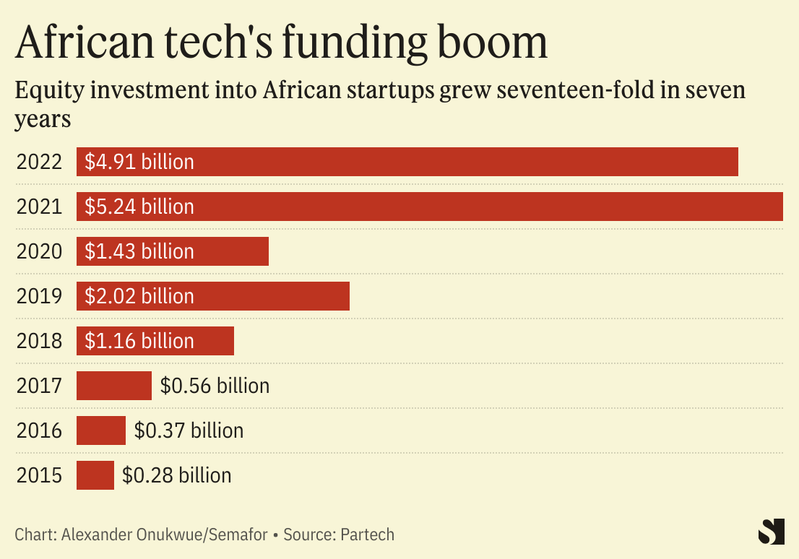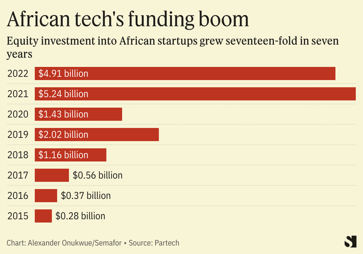Equity investment into African startups reached a peak of $5.2 billion in 2021, a year that saw at least 10 deals of $100 million or more into startups like Flutterwave, Chipper Cash, and TymeBank.