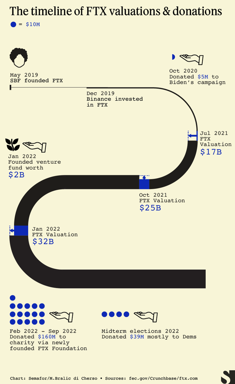 Panicked investors tried to sell their tokens, and FTX didn’t have enough cash to redeem them. Bankman-Fried, a major donor to Democratic candidates, frantically scoured Wall Street and Silicon Valley billionaires for a $1 billion-plus lifeline, Semafor reported Tuesday. He ultimately agreed to sell to Binance, but even that tentative deal quickly fell apart.