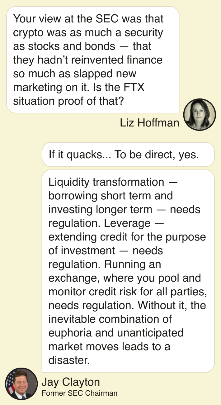 Liz wanted to know what former SEC Chair Jay Clayton, who ran the agency from 2017 to 2020 and tried to tackle some of the excesses of the crypto craze, made of the situation.