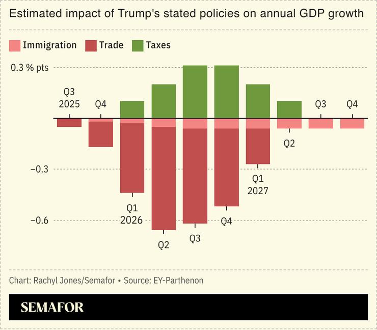 Economists have warned that the president-elect’s pledges to increase tariffs on imports and deport undocumented workers may cause inflation to rise. The question is the speed at which his policies will make their mark on the economy. According to data from EY shared with Semafor, Trump’s proposals could trim a few basis points off US GDP growth each quarter over the next few years, beginning in mid-2025. EY forecasts that across the 10 quarters from 2025 to 2027, Trump’s policies would bump the expected GDP growth only once. The impact will take at least six months after Trump takes office to be felt, EY’s Gregory Daco said. “The US economy is a big tanker,” he told Semafor. “Even with big policy changes, it just doesn’t turn that quickly.”