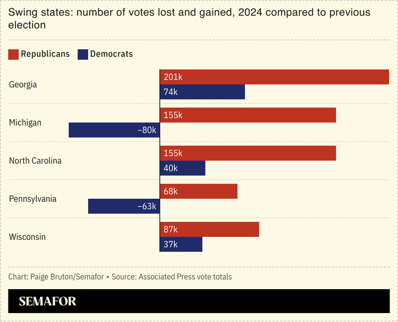 In four swing states, Harris was even able to win more raw votes than Joe Biden did four years ago: Georgia, Nevada, North Carolina, and Wisconsin. Adjusted for population growth, that didn’t mean much in the first three states, and Black turnout was disappointing enough to Georgia Democrats that Sen. Jon Ossoff is calling for a change in party leadership. But there was no overall decline in Democratic votes.