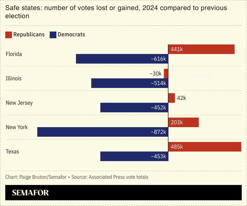 Harris will win fewer votes than President Joe Biden did four years ago — but the decline was significantly steeper in safely red or blue states than in swing states. Where there was no national campaign spending on turnout, and where voters knew that they were unlikely to change the outcome, Harris ran further behind Biden.