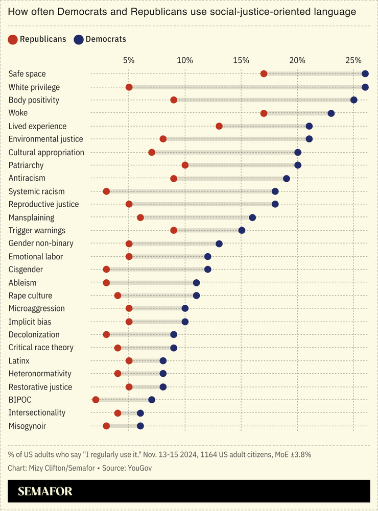 Just 20% of adults said that they regularly used the term “safe space,” the most popular of the 30 terms tested last week, according to the poll shared first with Semafor. Fifty-six percent of adults said that they’d heard the term, but don’t regularly use it. Majorities said the same about the terms “white privilege” (64%), “trigger warnings” (55%), “gender non-binary” (54%), and “woke” itself.