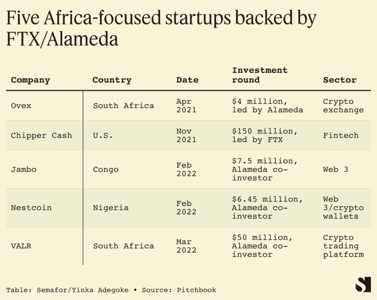 FTX invested in several African players, most notably leading a funding round of $150 million into Chipper Cash, a Africa-focused fintech unicorn headquartered in San Francisco. Others include Mara, Jambo, Ovex, and VALR, based on records seen by Semafor, though industry insiders told me there may be more.
