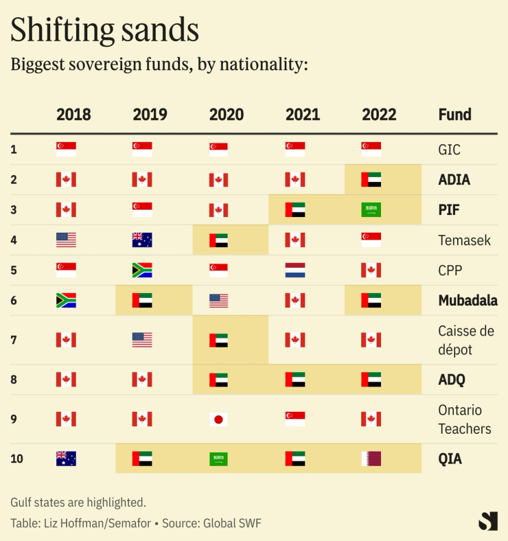 In 2018, none of the 10 most active sovereign wealth funds were Middle Eastern, according to Global SWF. Half were Canadian. In 2022, five were from the Gulf — including two, ADQ and ADIA, controlled by Bourkoff’s biggest investor, Sheikh Tahnoon. High oil prices are only adding to their coffers.