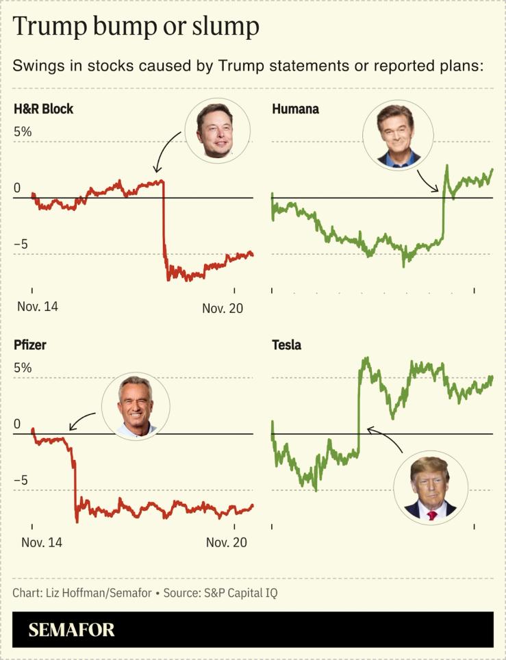 Trump’s busy policy teams, swifter to action than in 2016, have added market volatility, too. A Washington Post story that his government-efficiency czars, Elon Musk and Vivek Ramaswamy, want to build a free tax-filing app sent shares of H&R Block and TurboTax owner Intuit down more than 6%. Tesla shares rose on a Bloomberg report that Trump wants to ease rules for self-driving cars.