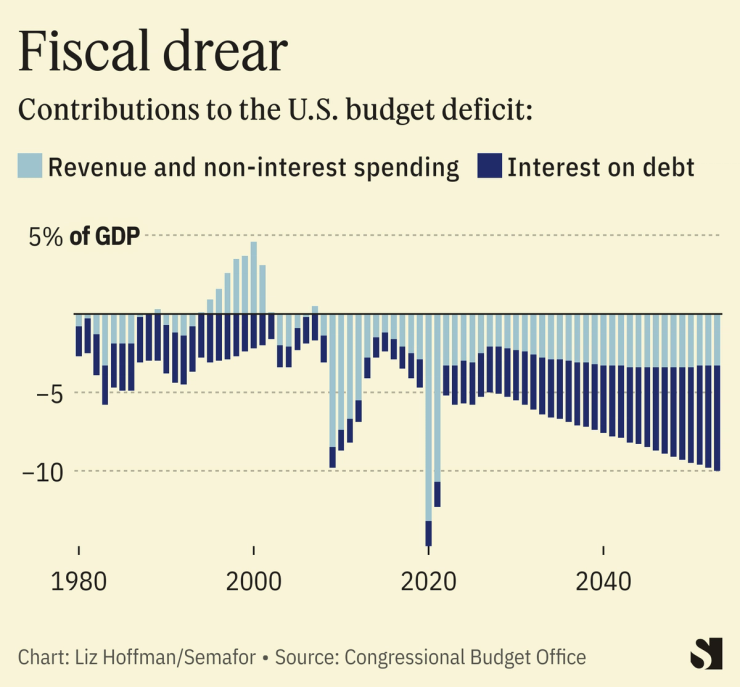 Already 2.5% of the U.S.’s economic output is going to service its existing debts, a number that some analysts expect to hit 4% by 2030. Already running huge deficits, the only way for Treasury to pay the interest — along with ambitious spending programs like the CHIPS Act and student-loan forgiveness — is to keep borrowing.