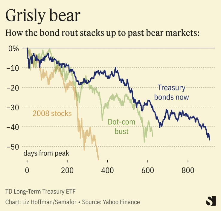 The result: Investors are demanding the steepest yields since 2007. Auctions of fresh bonds that were once routine are now going terribly. And bond portfolios are getting absolutely hammered. The longest-dated Treasury bonds are in a bear market worse than the dot-com bust and almost as bad as 2008.