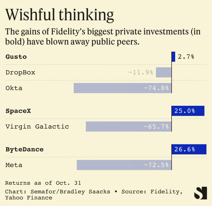These valuations can be hard to explain. Fidelity, for example, increased the value of its stake in HR software unicorn Gusto, previously known as ZenPayroll, by 2.7% this year even though public peers like Dropbox and Okta have shed billions in market cap. The firm declined to comment on individual security valuations.