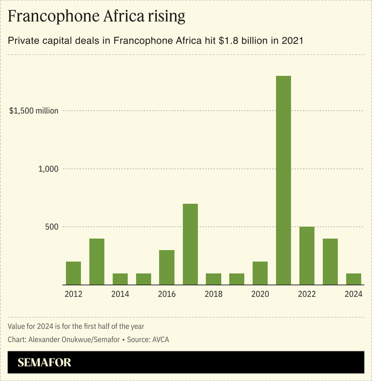 The African Private Capital Association (AVCA) industry body, in a report seen by Semafor Africa that focuses on 21 sub-Saharan African countries which use French as an official language, said venture capital funding underpinned 60% of deals in Francophone Africa between 2021 and the first half of 2024. It had been “virtually absent” in those countries prior to 2016, according to the report.