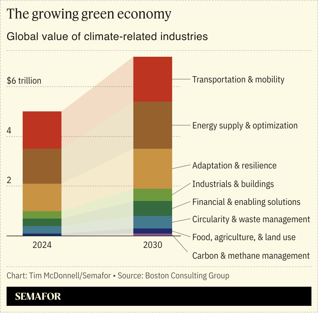 Whereas in the past many CEOs of large companies argued that sustainability-related investments were mainly a PR exercise, there’s a rapidly growing sense that “this is not about sacrificing the business, it’s about taking advantage of a growing part of the world economy,” Rich Lesser, BCG’s global chairman, told Semafor. The sustainability economy can be compared to AI, Lesser said: People might quibble about the pace at which it will progress, but “there’s no sense this trend will reverse. This is a long-term trend that is reasonable to bet on and probably risky to bet against.”