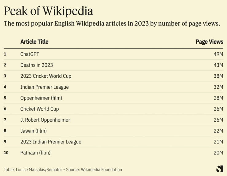 The most-read English-language page on Wikipedia this year was about ChatGPT, the chatbot that, perhaps ironically, was partly trained on Wikipedia’s thousands of articles.