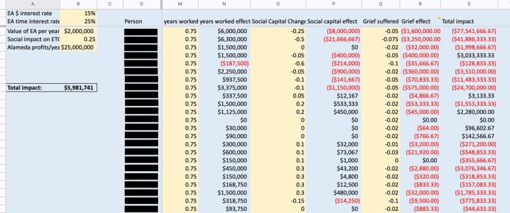 After half of Alameda walked out the door, Bankman-Fried took stock of the situation in the same way effective altruists determine how to deploy charity funds. In a May 2018 spreadsheet obtained by Semafor, Bankman-Fried assigned dollar figures to everything from the “grief effect” each employee experienced as a result of the turmoil to the cost to the EA movement of leaving their previous jobs for Alameda.