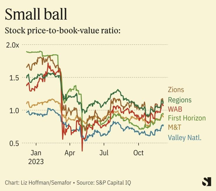 “There’s an earnings problem,” Citizens Bank CEO Bruce Van Saun told me. His $225 billion bank wasn’t in existential danger this spring, but now trades at 60% of book value. Customers have returned, but at a cost; Citizens’ interest paid on deposits has risen from less than $200 million in the first quarter to $900 million in the third.