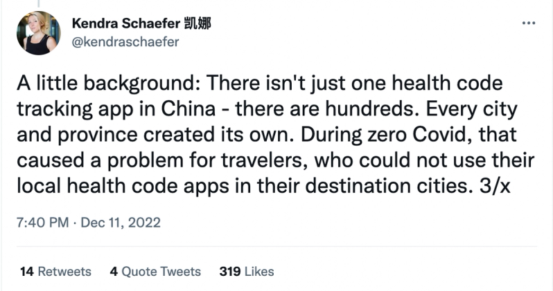 Kendra Schaefer of Trivium, a policy research organization in China, suggested in a Twitter thread that the end of the Tongxin app “doesn’t actually change much” in terms of how the government uses data.