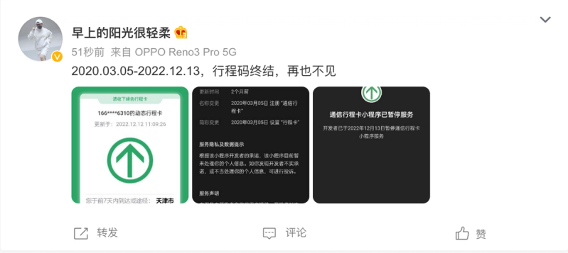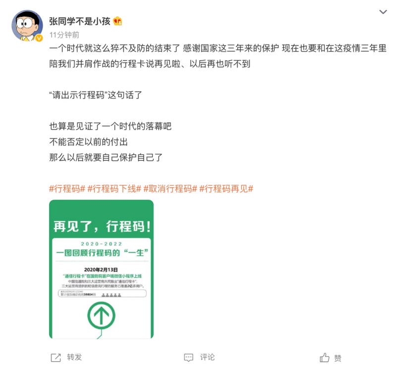 Many citizens on Weibo posted celebratory messages hailing the end of the Tongxin Xincheng Card travel tracking app (通信行程卡), which had been used since 2020 to determine whether residents had been in high-risk areas in order to decide their testing and quarantine requirements.