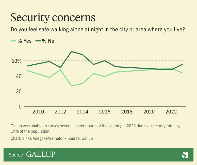 → What does Gallup think? Gallup’s polling research shows that personal safety is a key issue for Congolese citizens. “A majority of Congolese feel unsafe walking alone in their area at night. With the exception of one year, this figure has never dropped below the majority level since 2009 (in years Gallup has been able to conduct surveys in the DRC).”