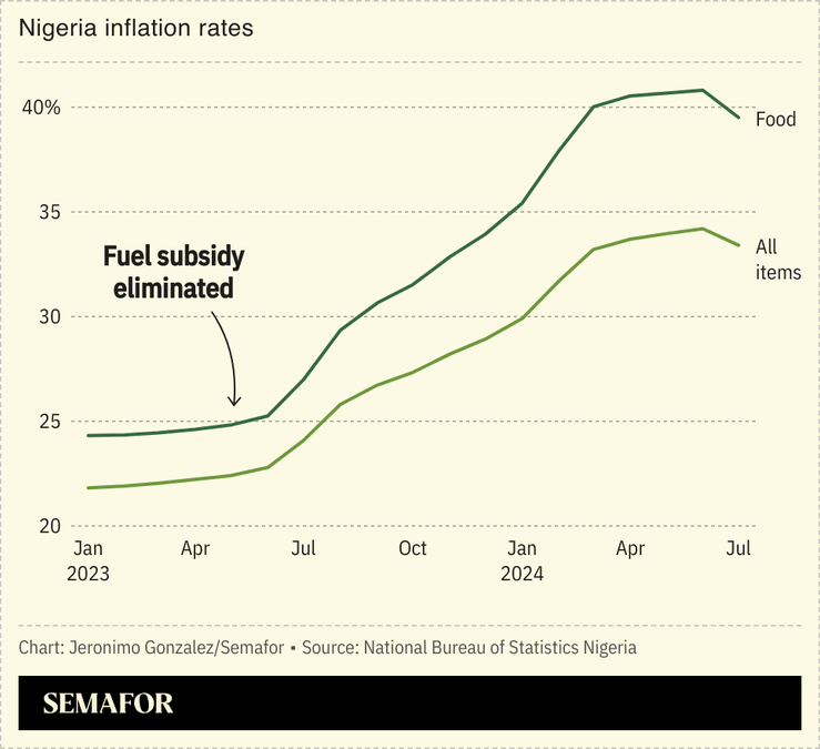 The latest official inflation figures rose to 34.6% last month — a 28-year high. But Nigerians who spoke to Semafor Africa said the situation feels even worse because prices change from day to day, making it hard for households and small businesses to make plans.